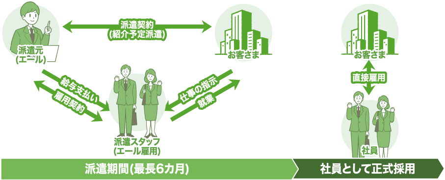 派遣先企業さまで直接雇用することを前提に、一時期間(最長6カ月)派遣します